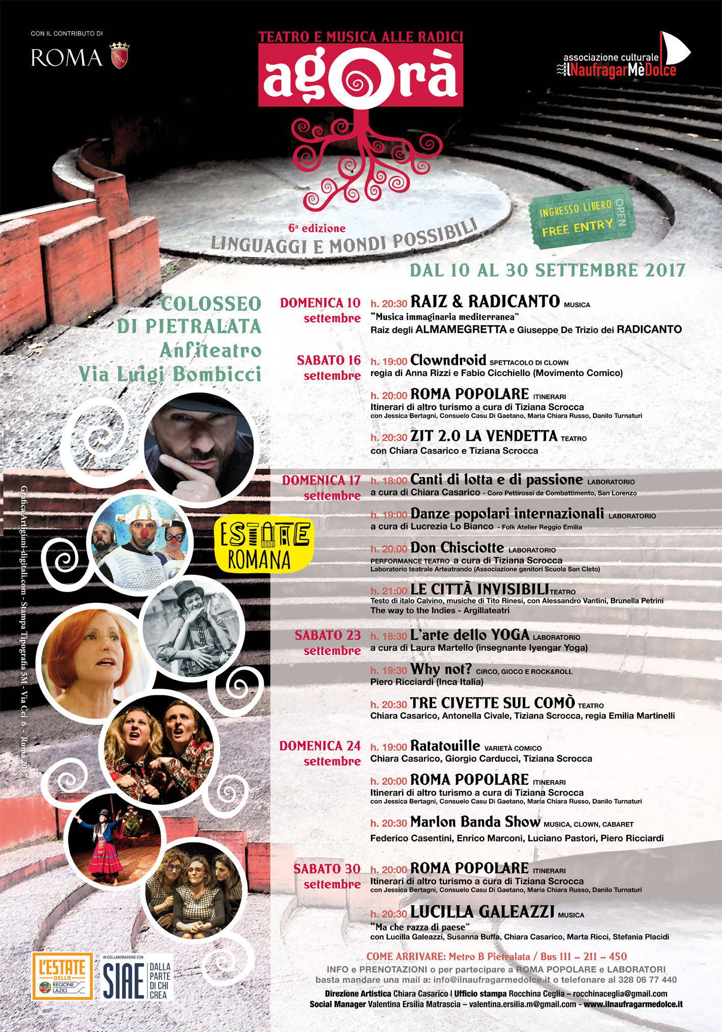 Da ormai sedici anni, l’associazione culturale Il NaufragarMèDolce porta lo spettacolo dal vivo fuori dai consueti spazi teatrali e musicali, realizzando una serie di eventi nelle periferie storiche di Roma.Da sei anni “Agorà” è il festival che anima l’estate romana nella periferia est della Capitale.