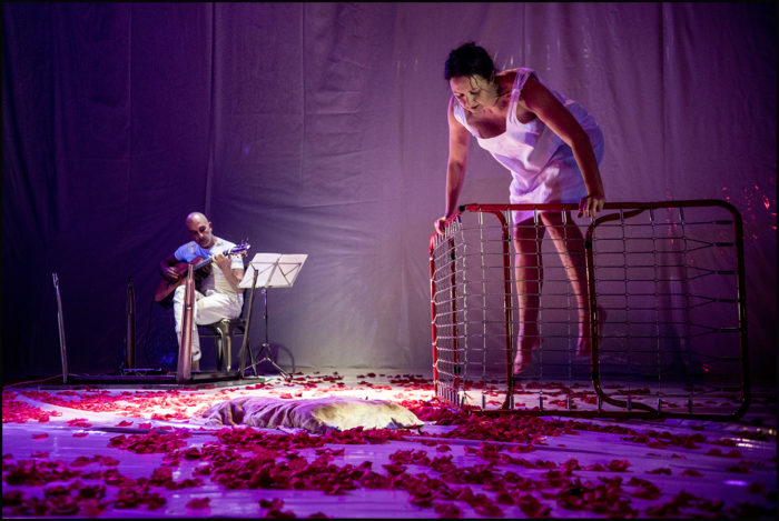 All’entrata del pubblico, la Ercolani è già sulla scena, vestita con un camicione bianco: si muove lentamente nella scenografia costituita da un grande tappeto di petali di rose e da due brandine. Una attaccata in verticale, bordata da dei fiori bianchi, come fosse una cornice o una finestra, con le grate. L’altra messa per orizzontale, e all’occasione spostata e lanciata. L’idea delle grate però rimane sempre. E un carrello di metallo, classico di un ospedale. Sullo sfondo, incorniciato da un quadrato di edera, quasi a confondersi con il fondo, ma allo stesso tempo ben visibile, Stefano Scarfone, ad accompagnare dal vivo, con la chitarra, tutto lo spettacolo.