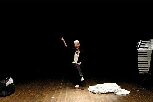 Dicevamo dunque di Elsa, musicista affermata, la quale in attesa del traghettatore, ci racconta la sua storia d’amore o, meglio, della sua mancata storia d’amore con la donna che l’ha sempre amata ma che lei, Elsa, ha sistematicamente deluso pur di continuare ad affermarsi come musicista. Il tempo e lo spazio neutro, “limbico”, dove il suo destino eterno non è stato ancora deciso e forse mai si deciderà (visto lo sciopero dello piscopompo di cui sopra) serve ad Elsa e anche a noi, per riflettere rievocare rimpiangere rammemorare scusare accusare rinfacciare la vita che ha vissuto e soprattutto la scelta che ha compiuto: la carriera al posto dell’amore. Carla Chiappino nella parte di Elsa è molto brava anche se all’inizio sembra un po’ troppo “teatrale” nell’impostare il personaggio, ma si scioglie a poco a poco, anzi si può dire che merito dell’attrice è quello di “evolvere” il personaggio in scena; senza dimenticare l’uso fantastico della voce che diventa davvero uno strumento nelle mani anzi a portata dello spirito confessante di Elsa: la voce viene usata a mo’ di pianoforte, lo strumento musicale di Elsa; lo strumento musicale che ha reso Elsa famosa nella vita; solo nella vita… terrena.