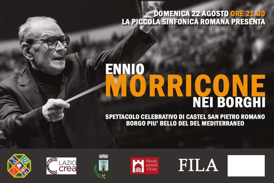 Domenica 22 nella magica notte di Castel San Pietro Romano, caratteristico borgo, a 40 km da Roma, perfettamente restaurato e anzi arricchito da un anfiteatro che si affaccia, con un panorama mozzafiato, su quella Roma notturna che tanto ha dato al nostro cinema, non solo Cinecittà, ma le tante location dal centro storico fino all’estrema periferia, pensiamo al quartiere Bastogi, set dell’ultimo film di Abanese, si è creato attraverso le note di Ennio Morricone un ponte di celluloide tra un borgo che ha visto tra i suoi vicoli e piazze film che hanno fatto la storia del cinema (uno fra i tanti: Pane amore e fantasia con Vittorio de Sica e Sofia Loren) e la città eterna che è stata per molti anni la capitale del cinema mondiale con i suoi studios.