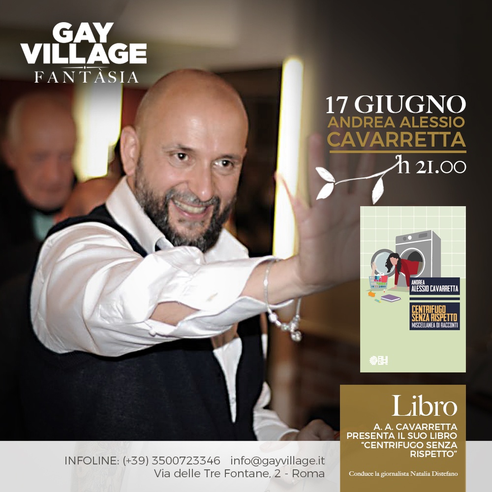Sabato 17 giugno alle ore 21.00, Andrea Alessio Cavarretta salirà sul palco del Gay Village per presentare il suo libro: Centrifugo senza Rispetto-Miscellanea di Racconti, edizioni Augh!