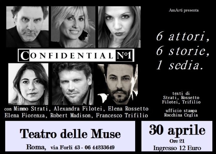 Il 30 aprile al Teatro delle Muse di Roma sarà in scena uno spettacolo particolare che nasce da un’idea di Millo Strati e Elena Rossetto. Si tratta di una rassegna di attori e storie, 6 nello specifico, dal titolo CONFIDENTIAL, che è al suo debutto nazionale e pertanto è la N°1.