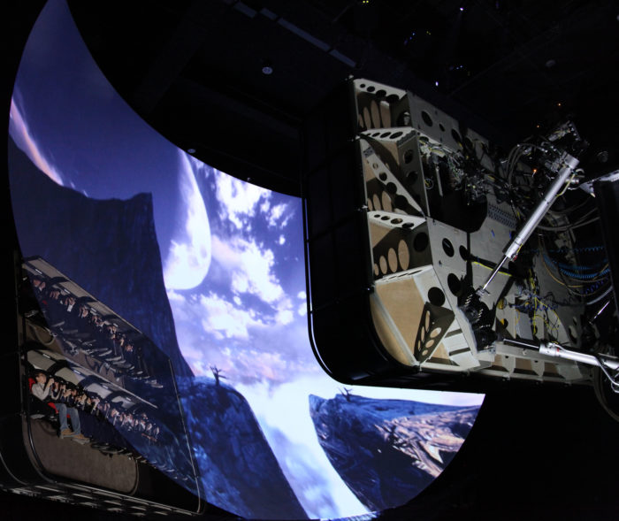 Il viaggio degli ospiti comincia a terra, all’interno di un mega supercomputer. Siamo al cospetto dell’Intelligenza Artificiale più avanzata che ci guida tra i segreti degli effetti speciali del cinema: è D.I.O., il Digital Intelligence Officer. Un ascensore futuristico ci solleva fino al livello del cinema, una piattaforma elettro-idraulica che svetta nel grande teatro. Di fronte a noi l’immenso schermo concavo da 25 metri con proezioni in 4K che ci avvolge e immerge letteralmente nella scena. Da qui la sensazione di volare, grazie ai 6 assi di movimento (DOF) e ai ricchi effetti speciali (aria, acqua, odori…).