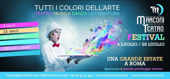 Uno dei più grandi eventi estivi della Capitale, dedicati all’arte nella sua totalità, prende il via il prossimo 4 luglio. Dopo i successi delle passate edizioni, il sostegno del pubblico e la richiesta di tantissime compagnie nazionali, torna per il quarto anno consecutivo il Marconi Teatro Festival. Come negli anni scorsi, anche quest’estate la manifestazione diretta e voluta da Felice Della Corte offre al pubblico una molteplicità di eventi che spaziano dal teatro alla musica, passando per la danza e la letteratura.