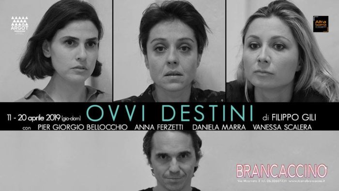 Dopo il successo della Trilogia di Mezzanotte nelle precedenti stagioni teatrali, Filippo Gili è pronto a debuttare con il suo nuovo lavoro drammaturgico, Ovvi destini. Un cast di quattro straordinari interpreti sarà protagonista del progetto inedito del regista e drammaturgo romano: Vanessa Scalera (recentemente protagonista in Lea di Marco Tullio Giordana e co-protagonista di Silvio Orlando in Lacci), Anna Ferzetti (attualmente al cinema con Domani è un altro giorno) e Daniela Marra (da poco reduce da Squadra Antimafia e dalla fiction Il Cacciatore). Completa il cast la presenza di Pier Giorgio Bellocchio, figlio del regista Marco e protagonista di diverse importanti pellicole. Debutto nazionale al Teatro Brancaccino di Roma dall’11 al 20 Aprile 2019, per quello che si preannuncia come uno dei più interessanti lavori della stagione teatrale 2018/19.