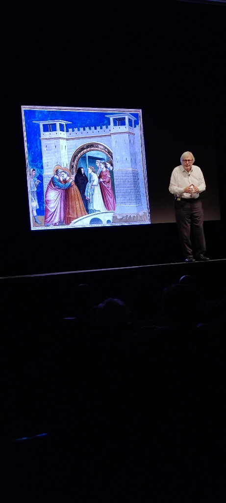 Giotto che nelle sue opere riesce a dar vita ai sentimenti, che è capace di ritrarre il silenzio, l’amore, il desiderio e la malinconia, trasforma i suoi affreschi in magnifiche poesie. Così nel famoso affresco della Cappella degli Scovegni a Padova nell’incontro tra Anna e Gioacchino davanti alla porta d’oro riesce a farci percepire tutta la poesia di un amore puro e pieno: “la più bella immagine dell’amore nella storia della pittura” la definisce Sgarbi.