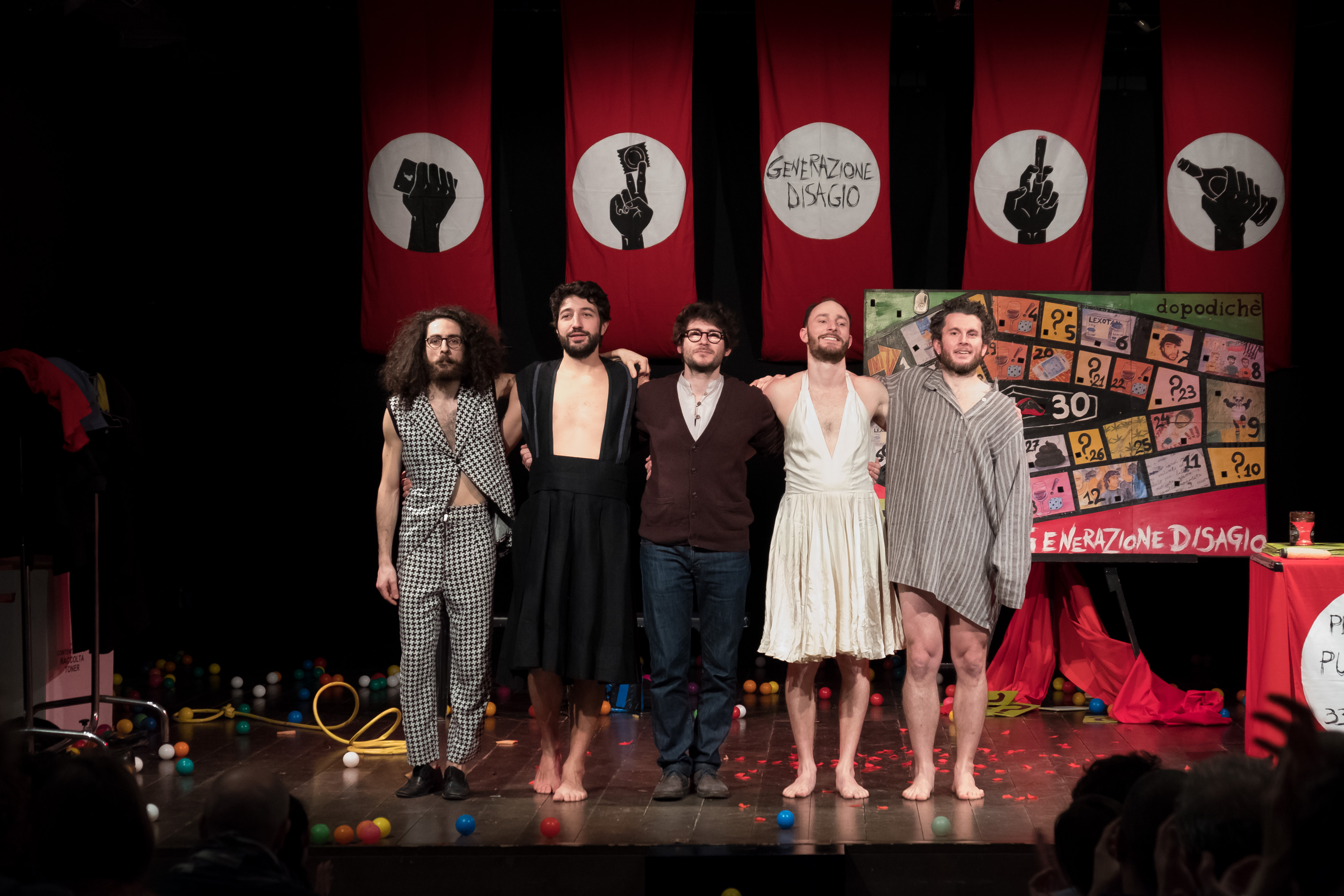 E’ un collettivo informale creatosi nel 2013 dall’incontro di Enrico Pittaluga, Graziano Sirressi, Luca Mammoli, Alessandro Bruni Ocana e Riccardo Pippa. Dopo essersi conosciuti alla Civica Scuola D’Arte Drammatica “Paolo Grassi” di Milano, hanno tutti percorso strade che li hanno portati a collaborare con diverse e importanti realtà del panorama teatrale nazionale. Anni dopo si ritrovano su proposta di Enrico Pittaluga, e a partire da una sua idea, danno vita collettivamente allo spettacolo: “Dopodiché stasera mi butto”. GENERAZIONE DISAGIO nasce come esigenza artistica di dare voce a tematiche di una generazione di mezzo altrimenti non rappresentata. Mosso dalla voglia di creare qualcosa di proprio, il gruppo si distingue fin da subito per la grande capacità di coinvolgimento e di attrazione di artisti, amici e collaboratori che prestano la loro opera e i loro consigli al progetto (video maker, illustratori, costumisti, scenografi e altri attori). GENERAZIONE DISAGIO non è una compagnia teatrale fissa, ma un luogo di incontro di diversi artisti che convergono per lavorare su tematiche condivise che cambiano da progetto a progetto. Si prefigge di essere aperto e sociale, popolare e inclusivo. GD si rivolge a una nuova collettività, una identità allargata, una classe sociale nell’era dell’annullamento delle classi sociali. GD parla di una condizione comune: l’avere fatto del disagio la nostra condizione abituale. Il gruppo collabora con molte realtà artistiche e culturali e al momento porta in scena i suoi due spettacoli “Dopodiché stasera mi butto” co-prodotto dall’associazione culturale Proxima Res e “Karmafulminien – figli di puttini” prodotto dal Teatro della Tosse di Genova.