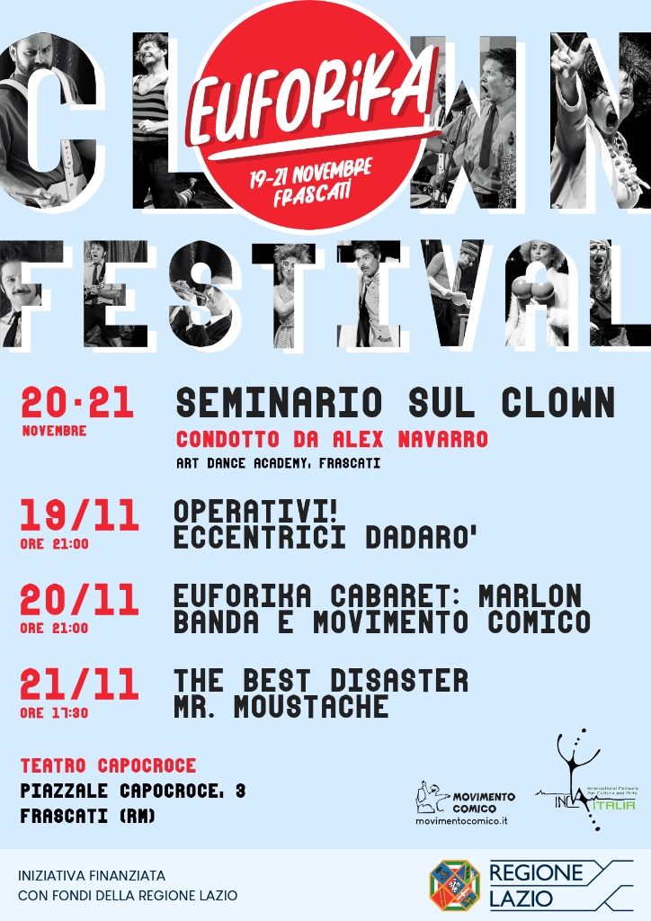 Dal 19 al 21 novembre la città di Frascati verrà animata dal meraviglioso mondo del clown. Arriva la Prima Edizione di Euforika Clown Festival che, in tre giorni, si propone di  condurre gli spettatori alla scoperta di una comicità semplice e sempre attuale, in grado di stupire e divertire un pubblico di tutte le età. Tre spettacoli imperdibili, in scena al Teatro Capocroce, e un seminario intensivo, che si terrà  presso l’ Art Dance Academy in via Pietro Gagliardi 1, condotto da Alex Navarro, ex clown de il Cirque du Soleil. Eventi, questi, che daranno lustro all’intera manifestazione proposta nella cittadina poco fuori Roma.  Euforika Clown Festival è stato possibile grazie al finanziamento della Regione Lazio e organizzato da Movimento Comico APS in collaborazione con Inca Italia.