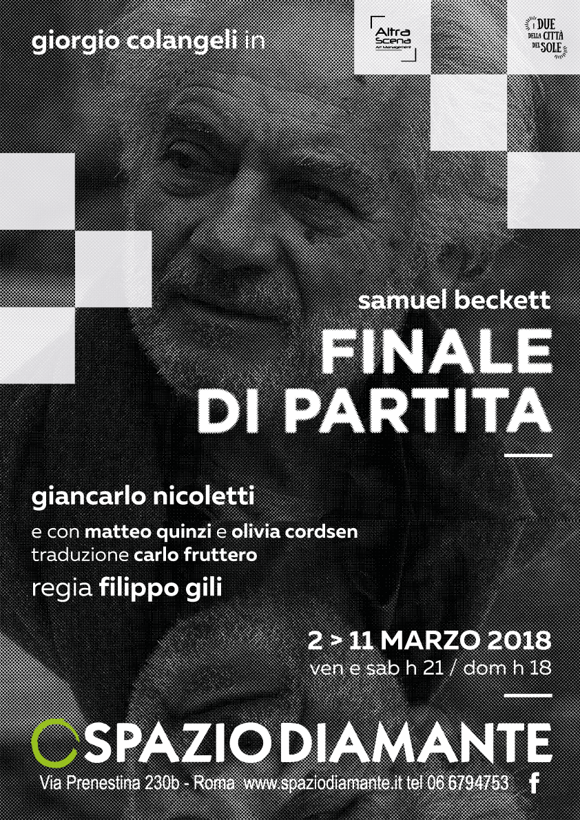 Debutta in prima assoluta allo Spazio Diamante, dal 2 all’ 11 marzoFinale di partita, il classico di Samuel Beckett, ritenuto da molti il testo più importante dell’autore irlandese. Dopo il successo di Aspettando Godot nella stagione 2016/17,Filippo Gili prosegue il suo originale personale percorso di ricerca attraverso le pieghe della drammaturgia beckettiana affrontando, sempre dalla sua personalissima angolazione, un altro dei capolavori del maggiore esponente del teatro dell’assurdo,Finale di Partita. Ancora una volta protagonista dell’operazione è la straordinaria attorialità di Giorgio Colangeli, che presta voce e corpo al ruolo di Hamm, affiancato da Giancarlo Nicoletti in quello di Clov. La nuova produzione di Altra Scena e I due della città del sole si preannuncia, così, come uno dei grandi appuntamenti della stagione 2017/18.