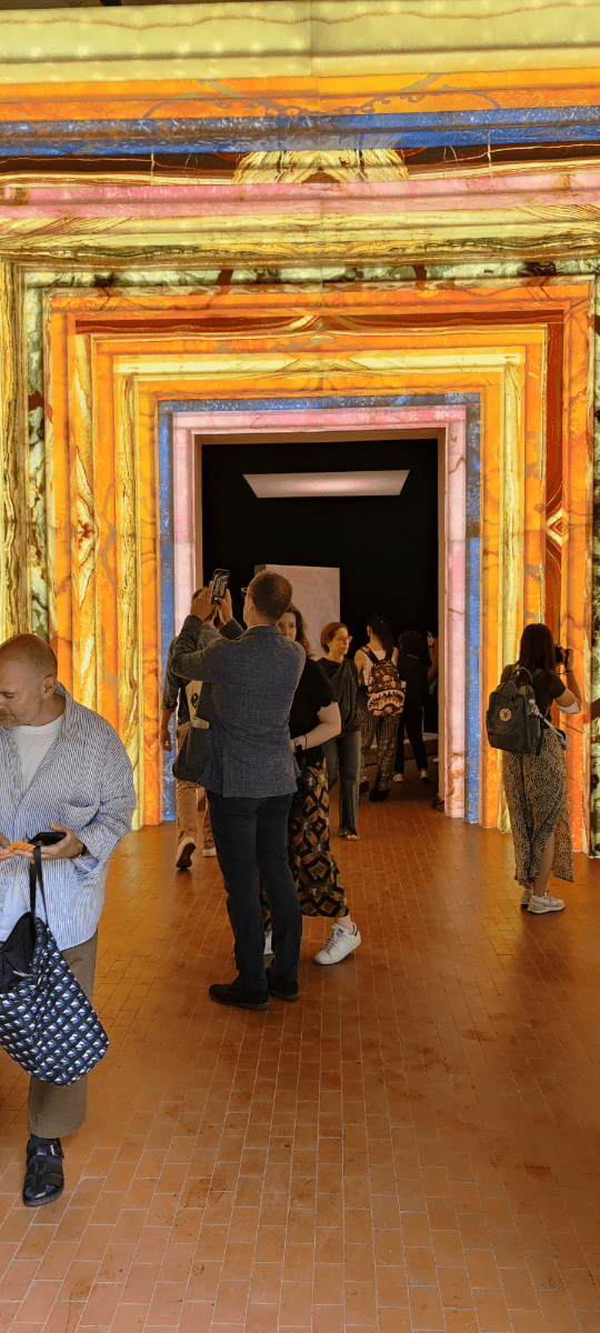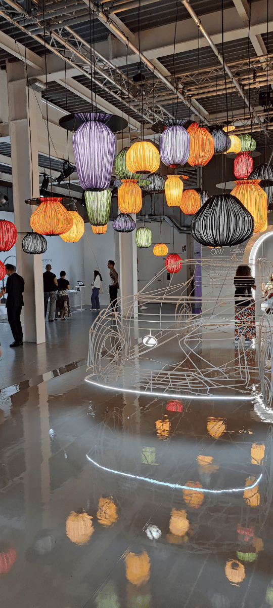 Suggestiva l’installazione onirica “Journey into a dream” realizzata nel sottotetto dell’edificio “E-Space” di Alcova, un viaggio tra i tessuti di The House of Lyria disegnata dalla scenografa cinematografica Alessia Anfuso. Si ha la sensazione di trovarsi sul ponte di una nave che punta verso il sole.