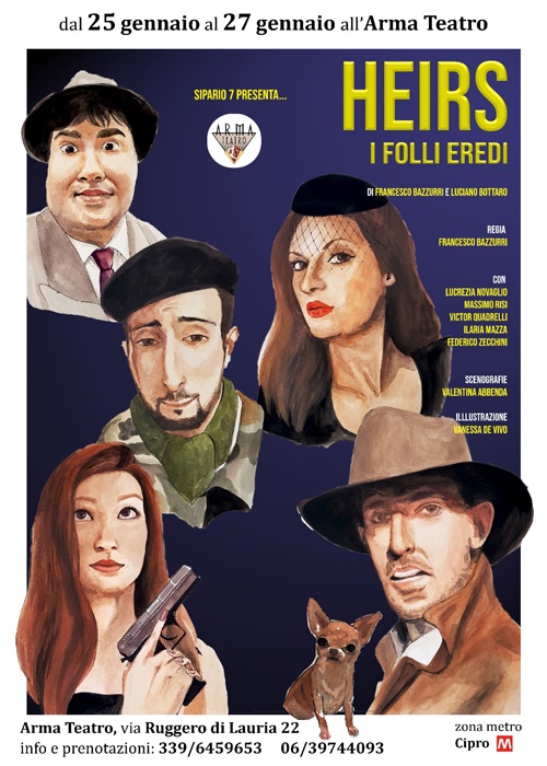 La Compagnia Sipario7 presenta Heirs – I folli Eredi. Commedia contemporanea in un atto che possiamo definire come il sacrificio ultimo agli dei del trash e del pop. Due fratelli e due sorelle in lotta per accaparrarsi l’eredità del defunto padre. Abbiamo un un survivalista che mangia larve con la disinvoltura di chi gusta un cioccolatino, un militare che sembra uscito direttamente da Full Metal Jacket, una psichiatra che colleziona tic nervosi e un’attrice d’avanguardia che segue il metodo Stanislavskij e Hutch. Assieme a loro, a condividere questa folle lotta, un notaio dalle personalità multiple.  Gli eredi scateneranno una guerra senza esclusione di colpi combattuta tra situazioni paradossali dove i nomi dei mobili di una nota casa celano parolacce in svedese, gli spot pubblicitari anni 80 si trasformano in storie da brivido, la discomusic crea dipendenza peggio del gioco d’azzardo ed altre scene demenziali condite con dialoghi dal ritmo rapido e scoppiettante che si susseguiranno fino alla Grande Prova Finale. Uno spettacolo per tutti, leggero e divertente.