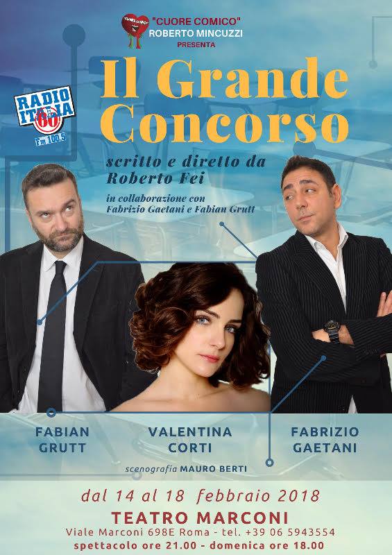 È in scena al Teatro Marconi dal 14 al 18 febbraio Il grande concorso. Lo spettacolo, scritto da Roberto Fei, che ne cura la regia, Fabrizio Gaetani e Fabian Grutt vede sul palco Fabrizio Gaetani, Fabian Grutt e Valentina Corti.