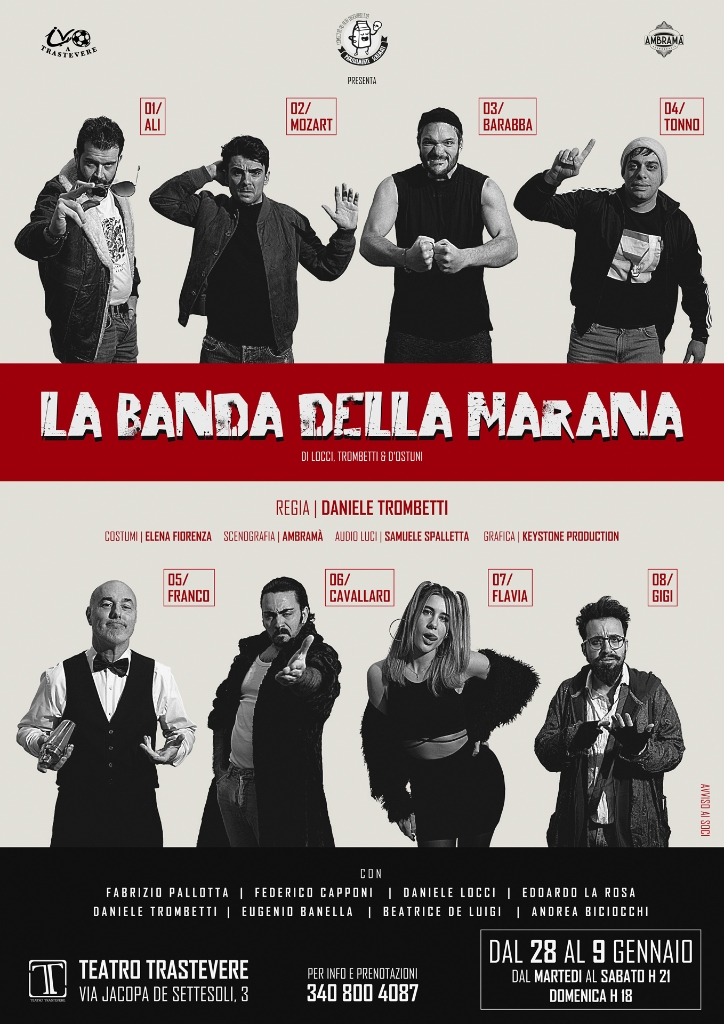 Dal 28 dicembre 2021 al 9 gennaio 2022 in scena al Teatro Trastevere di Roma lo spettacolo LA BANDA DELLA MARANA di Locci, Trombetti, D’Ostuni. Regia di Daniele Trombetti, con Edoardo La Rosa, Federico Capponi, Daniele Trombetti, Daniele Locci, Fabrizio Pallotta, Eugenio Banella, Beatrice De Luigi, Andrea Biciocchi.