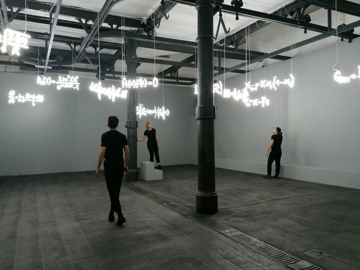 Si arriva poi all’ultima sala, dove il soffitto si fa cielo: le nuove costellazioni sono formule matematiche, le più celebri, che hanno rivoluzionato la vita nel corso dei secoli portando alla realtà attuale, realizzate in tubo al neon. Andrea Galvani con questa serie di installazioni architettoniche unite alla performance, punta l’attenzione sulla voglia di conoscenza che spinge l’uomo allo studio della realtà, analizzandola fino a dare una forma o una formula al pensiero astratto.
