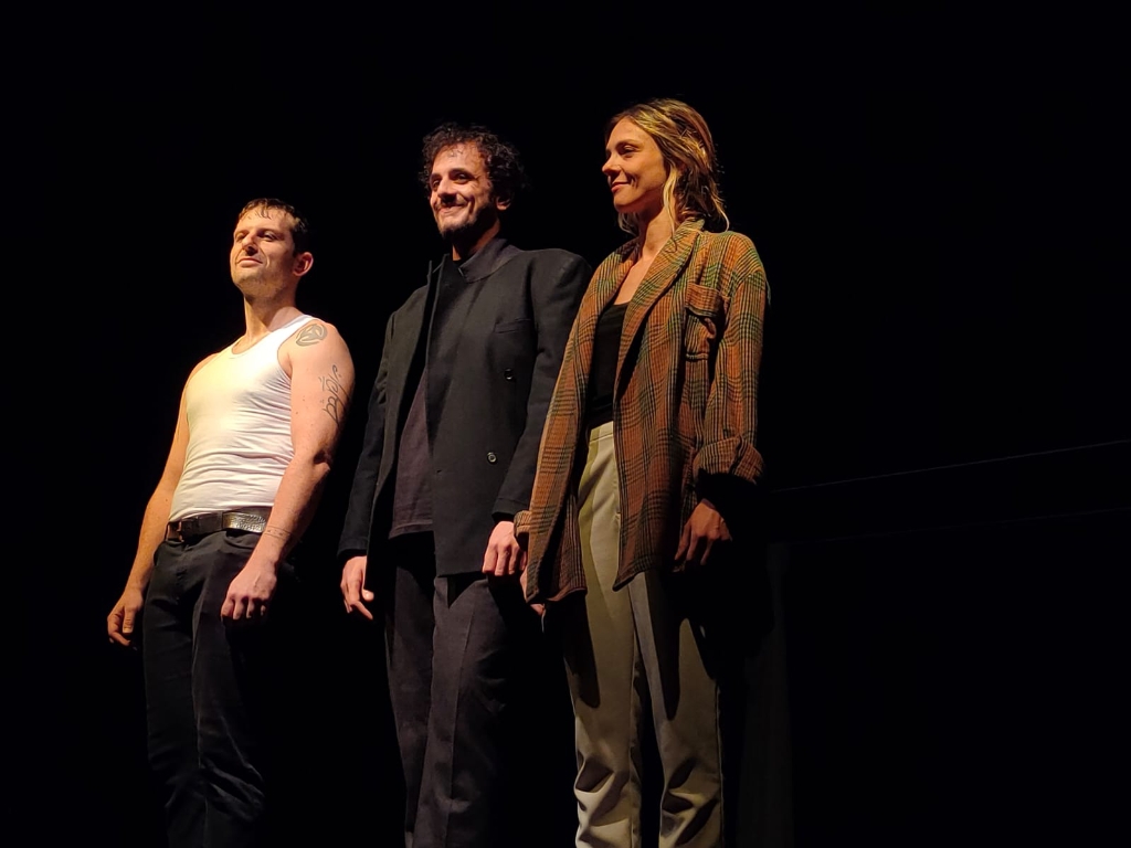Mastroianni è Dio, che discute con i due personaggi, ma si rivolge anche al pubblico in sala e lo coinvolge in questa “disputa” sull’amore, mentre Adamo (Milani) ed Eva (Balbo) sono alla scoperta l’una dell’altra, in un insieme di stereotipi e luoghi comuni che dalla notte dei tempi, sono giunti fino a noi. Rivolgersi a Dio per comprenderne le motivazioni appare l’unica soluzione e in questo l’autore ne è pienamente consapevole. Il ritmo è ben tenuto e la dialettica è sostenuta dalla capacità scenica degli attori che sono consapevoli dello spazio scenico e delle sue possibilità.