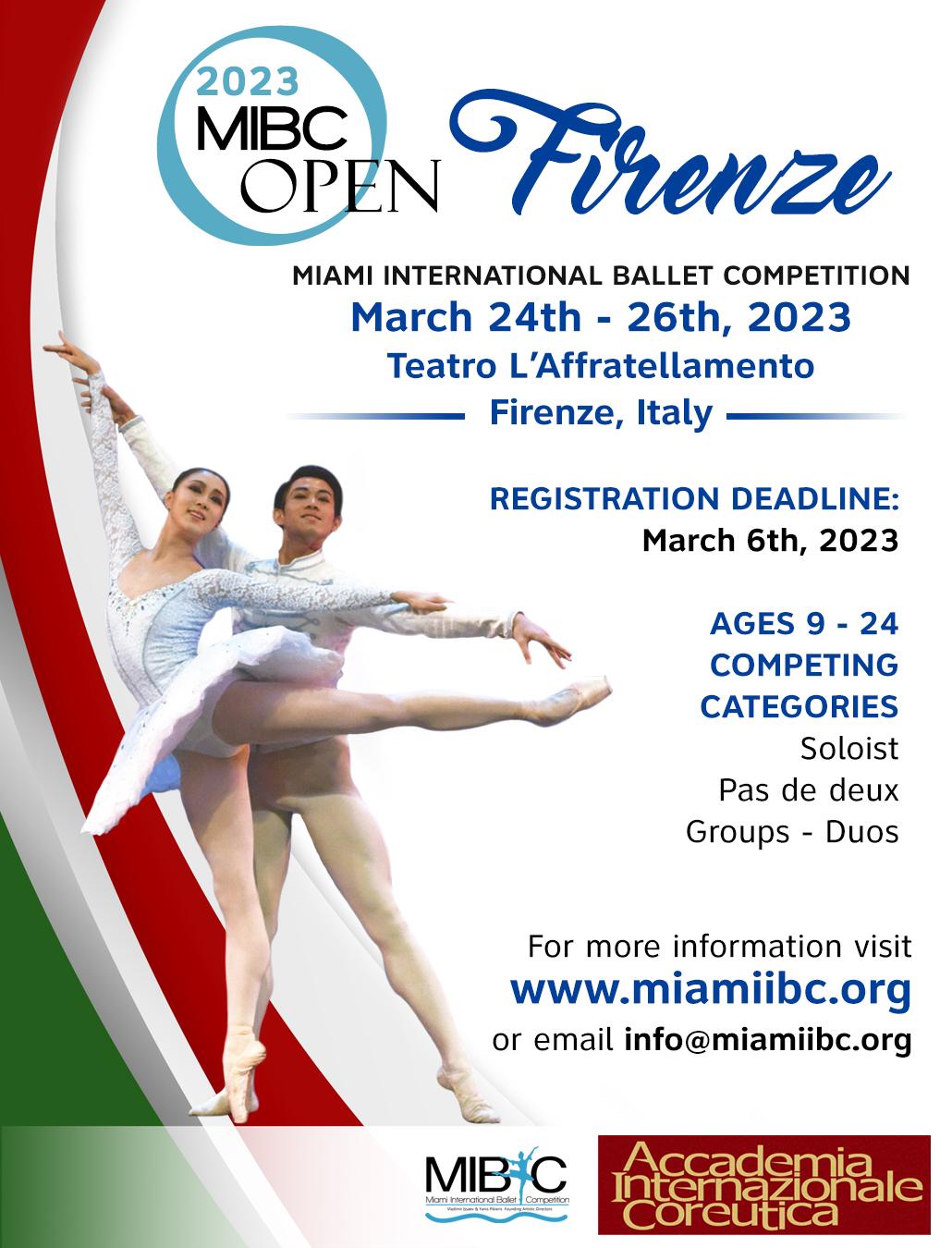 Sostenitori dell’evento sono Accademia Internazionale Coreutica di Firenze, Arts Ballet Theatre Of Florida e la Elmhurst Ballet School. Sarà possibile iscriversi al concorso iscrivendosi sul sito del concorso – https://www.miamiibc.org/2023mibcopenfirenze – entro il 6 Marzo 2023. Per maggiori informazioni è possibile scrivere a info@miamiibc.org