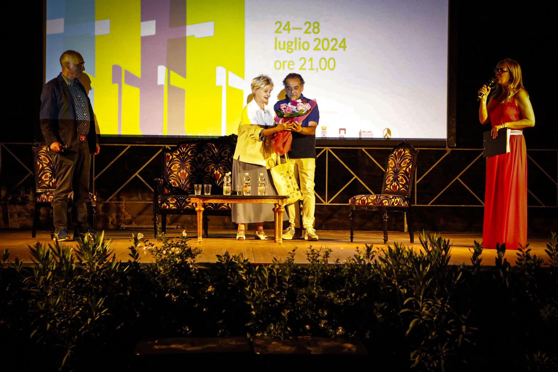 Insieme a lei sono saliti anche Alessandro Perrella e sua figlia Valentina per presentare il cortometraggio A occhi chiusi, dove il regista ha diretto le due donne. Dopo un piccolo incontro e la visione del corto, padre e figlia hanno ricevuto un dono da parte dell’amministrazione comunale di Castiglion Fiorentino, nella figura dell’assessore Alessandro Concettoni.