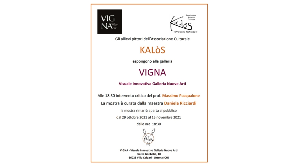 Gli allievi del terzo anno del corso di pittura dell’associazione culturale Kalòs, tenuto dalla maestra Daniela Ricciardi, dopo i successi della mostra estiva tenuta al Palazzo Ducale Valignani di Torrevecchia Teatina, espongono opere ad olio su tela ed acrilico alla Galleria Vigna – Visuale Innovativa Galleria Nuove Arti di Caldari di Ortona in piazza Garibaldi, 10.