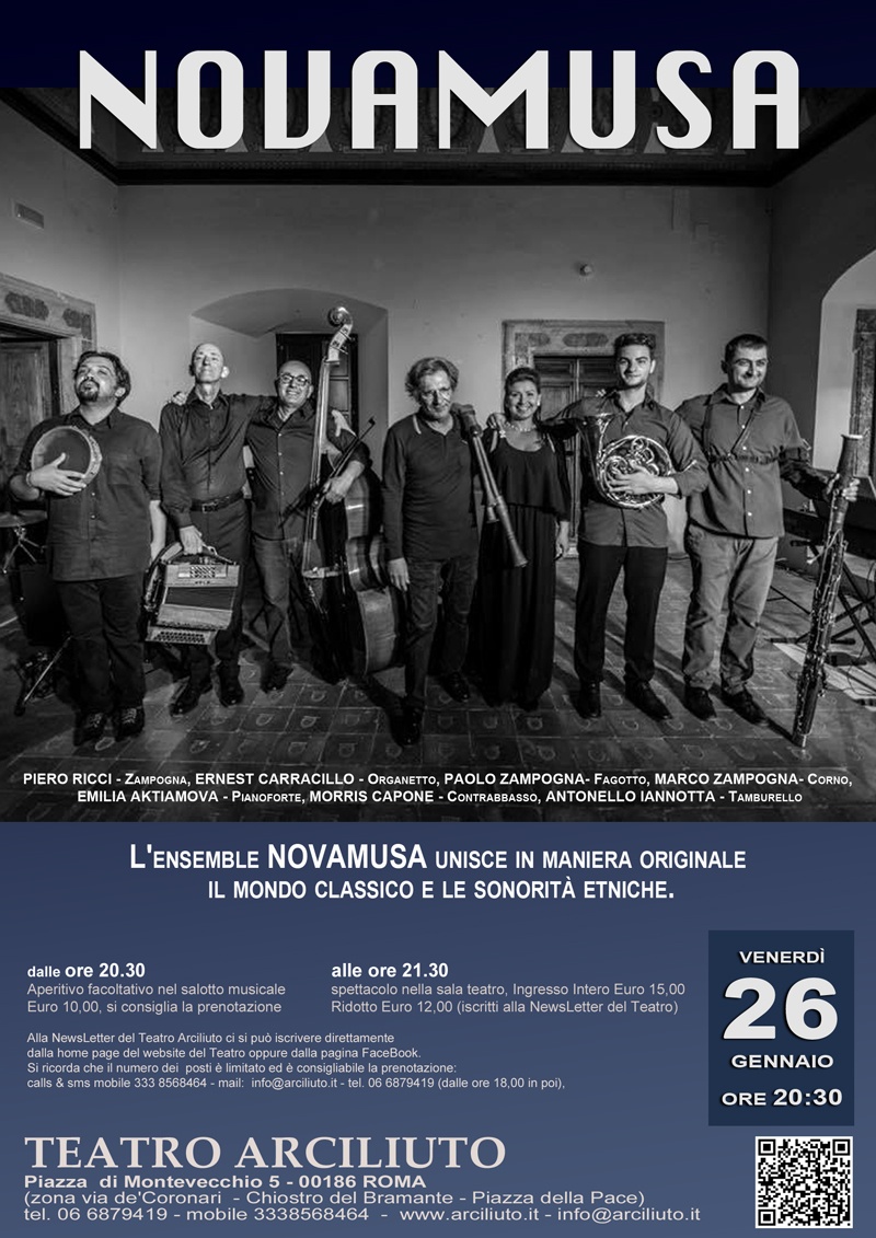 Venerdì 26 gennaio 2018, presso il Teatro Arciliuto di Roma, si terrà il concerto del gruppo NOVAMUSA.