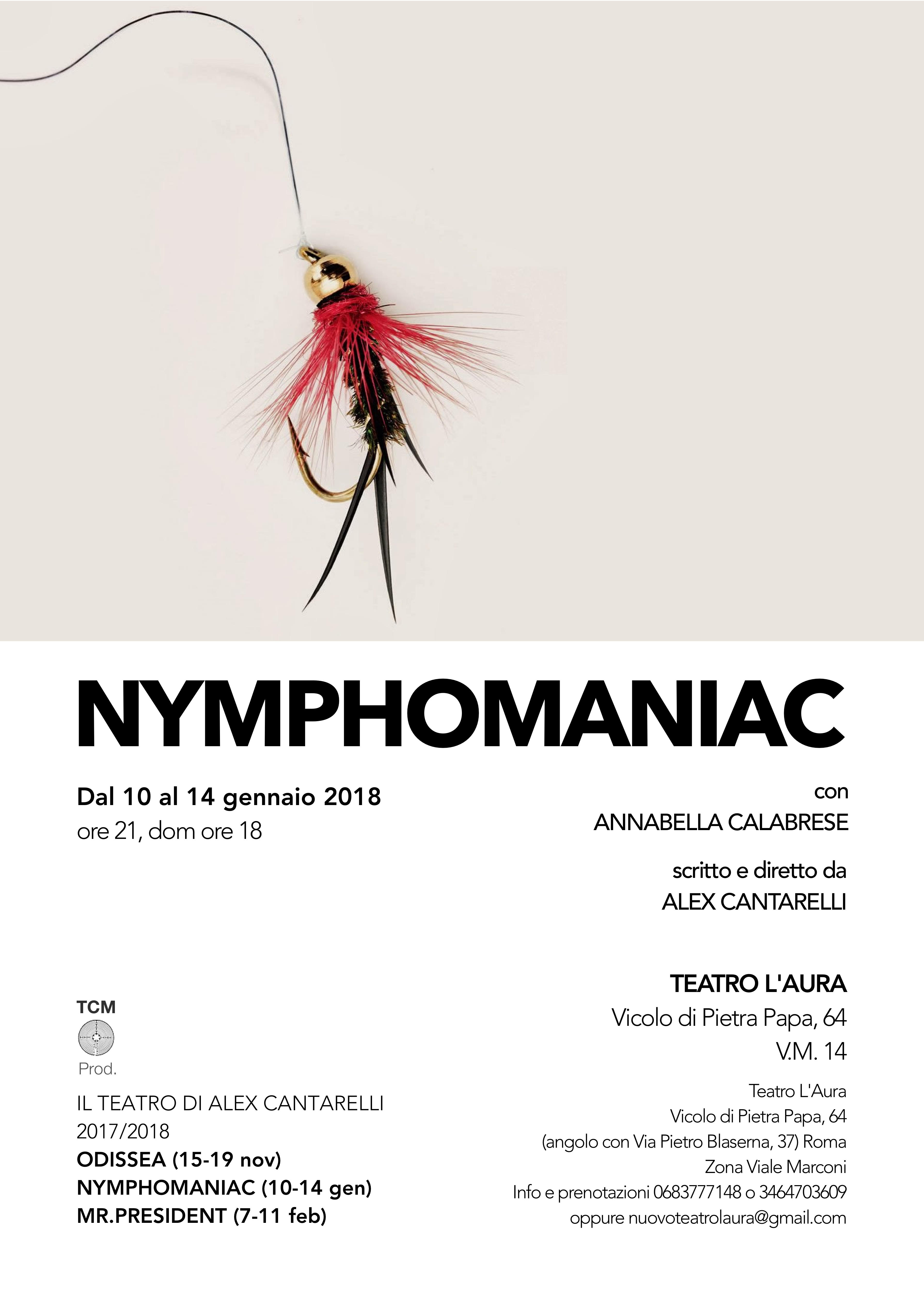 Dal 10 al 14 gennaio il Teatro L’aura, diretto da Laura Monaco, ospiterà un nuovo spettacolo di Alex Cantarelli dal titolo Nymphomaniac, che vede protagonista Annabella Calabrese.