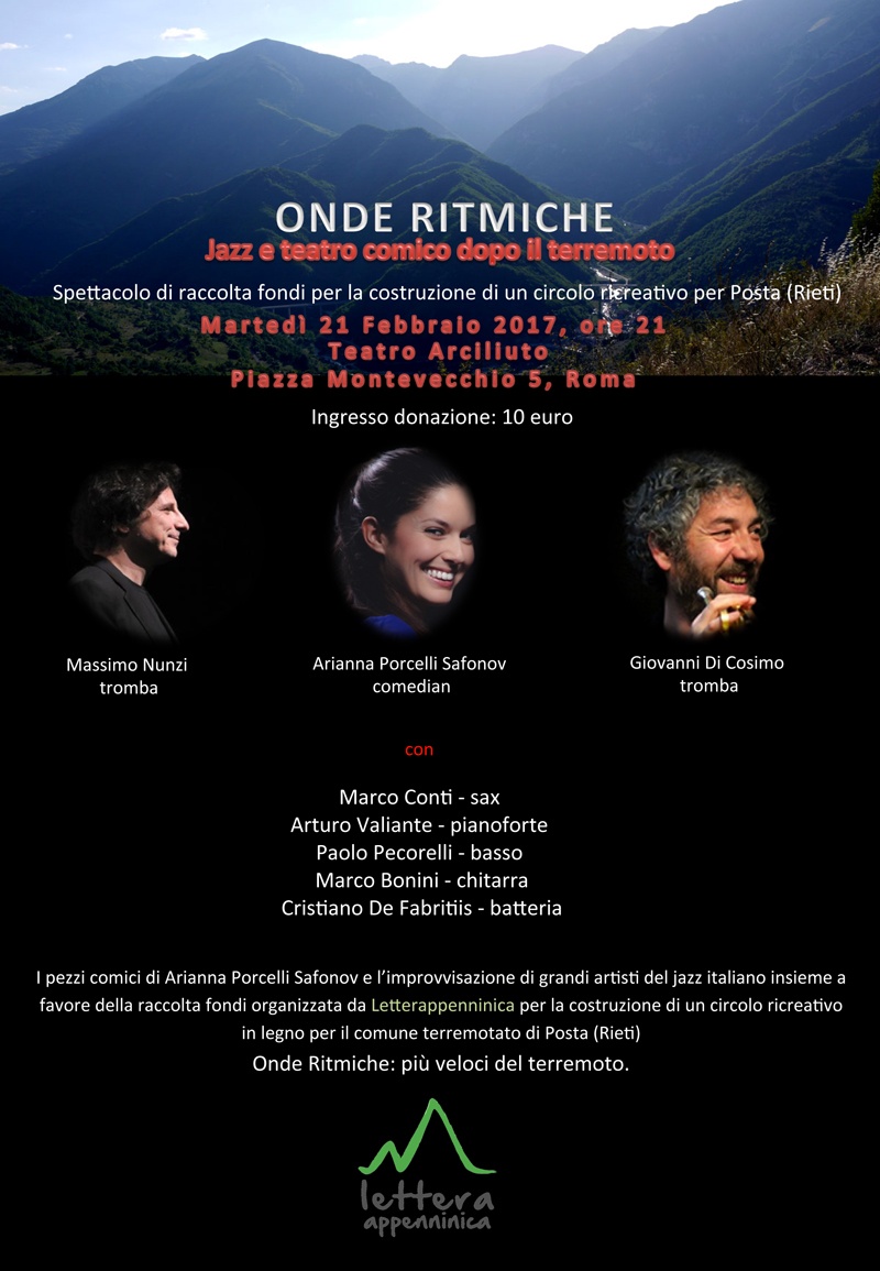 Martedì 21 febbraio il Teatro Arciliuto, nel cuore della Capitale, ospita “Onde Ritmiche – Jazz e Teatro Comico dopo il Terremoto”, uno spettacolo/concerto di improvvisazione letteraria e musicale, a favore della raccolta fondi organizzata dall’Associazione Letterappenninica per la costruzione di un circolo ricreativo per il comune di Posta (Rieti), un piccolo centro sul comprensorio del Monte Terminillo, rimasto un pochino fuori dall’attenzione mediatica, ma altrettanto drammaticamente colpito dal terremoto e dalle recenti violente nevicate.