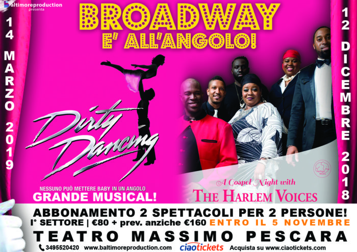 Non meno intenso e travolgente sarà invece il secondo appuntamento (marzo 2019) di “Broadway è all’angolo”, quello con Dirty Dancing: l’exploit di emozioni coinvolgerà anche il palco del Teatro Massimo di Pescara con il racconto di Baby e della sua storia d’amore con Johnny, il bel maestro di ballo, nata in una lontana estate degli anni ’60 nella scanzonata atmosfera del resort Kellerman. Com’è noto, anche alle nuove generazioni, si tratta di un incontro che si è trasformato in un vero e proprio cult senza tempo a livello cinematografico e teatrale. E’ il caso di dire che “Nessuno può mettere Baby in un angolo”!