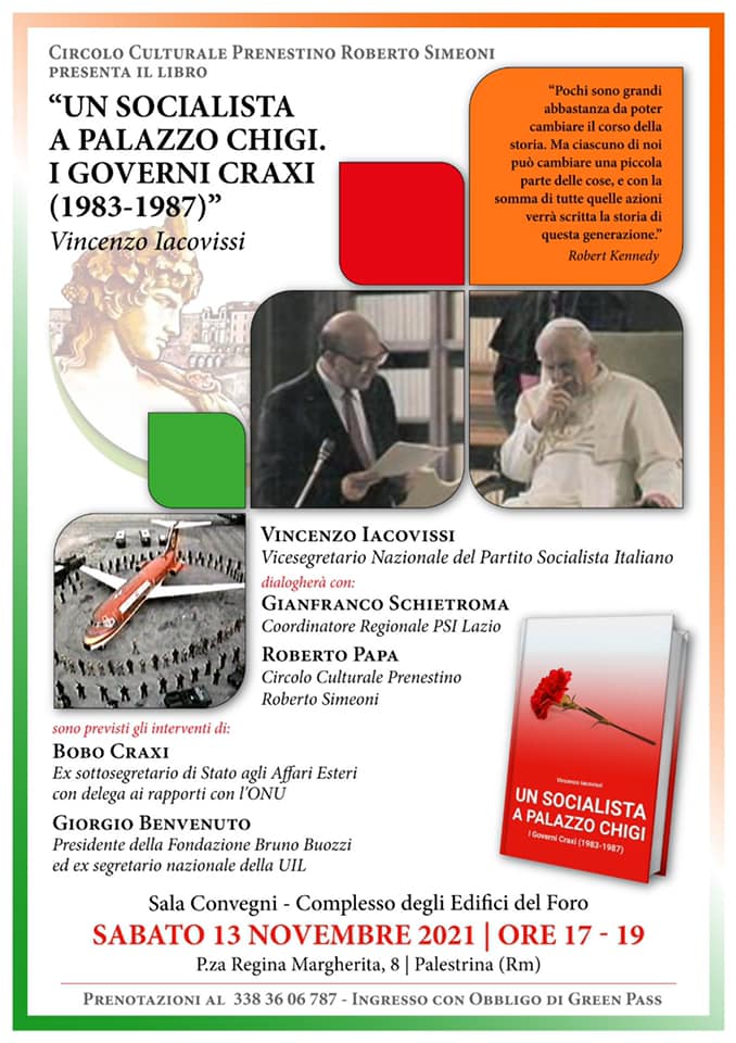 Il Circolo Culturale Prenestino Roberto Simeoni sabato 13, presso gli edifici del foro di Preneste a Palestrina, alle ore 17, presenterà il libro di Vincenzo Iacovissi, attuale vicesegretario nazionale del Partito Socialista Italiano, “Un socialista a Palazzo Chigi. I governi Craxi (1983-1987)”