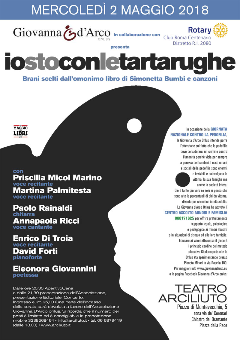 Mercoledì 2 maggio 2018, presso il Teatro Arciliuto di Roma, la Giovanna d’Arco Onlus con la partecipazione del Rotary Club Roma Centenario, in occasione della Giornata Nazionale contro la Pedofilia, presenta “iostoconletartarughe” (Emigli Editore). Interverranno l’Avv. Maria Pia Capozza(Fondatrice Giovanna d’Arco Onlus) e l’Avv. Antonella Volpe (Presidente del Rotary Club R.C.).