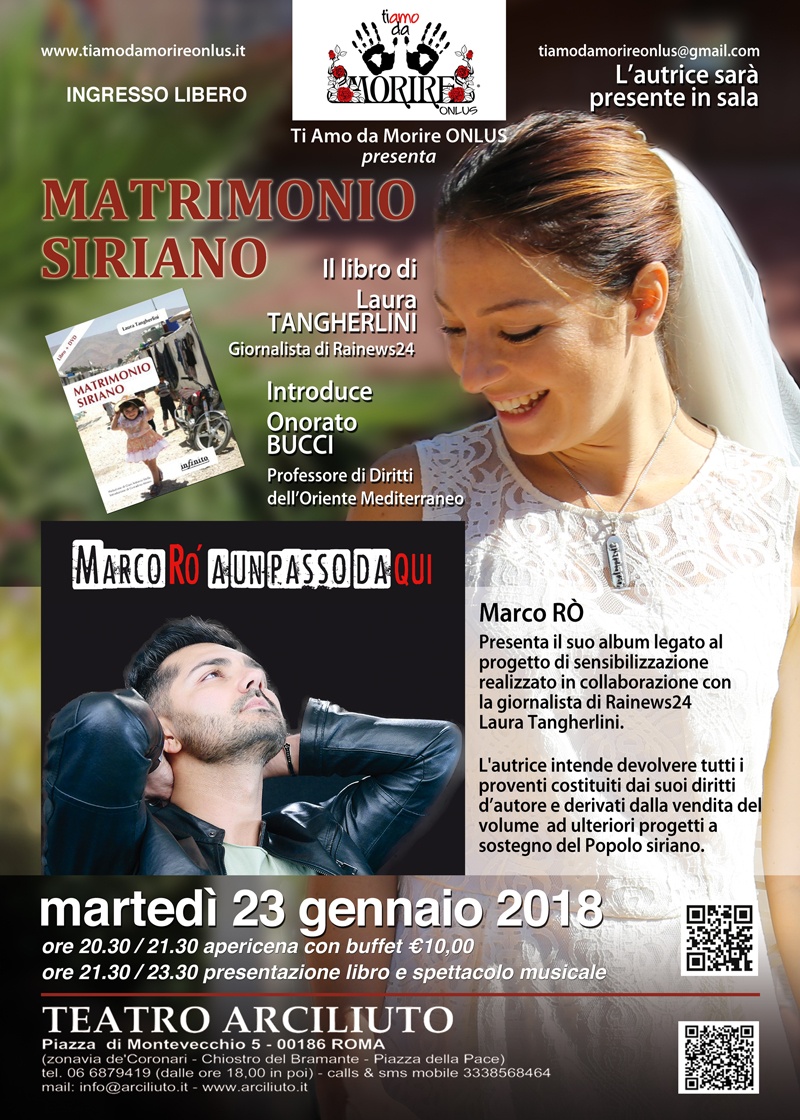 Martedì 23 gennaio 2018 al Teatro Arciliuto di Roma l’appuntamento è con gli Eventi di sensibilizzazione contro la violenza di genere organizzati dall’Associazione “Ti Amo Da Morire Onlus”. Nell’arco della serata verrà presentato il libro “Matrimonio Siriano” della giornalista di Rainews24 Laura Tangherlini cui seguirà lo spettacolo musicale “A un passo da qui”, presentazione del nuovo album del cantautore romano Marco Ro’.