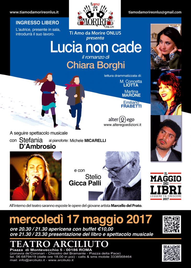 Mercoledì 17 maggio 2017, presso il Teatro Arciliuto in Roma, nell’ambito della Campagna Permanente contro la Violenza di Genere, l’Associazione “Ti Amo da Morire ONLUS” presenta il libro “Lucia non cade” di Chiara Borghi, edito da Alter Ego.