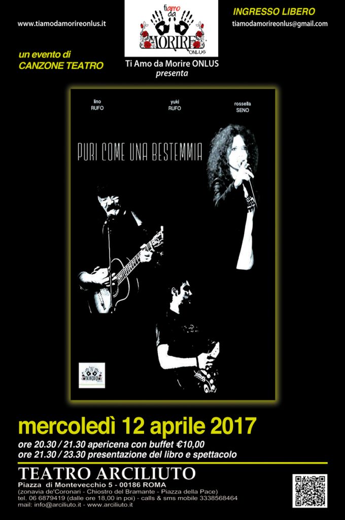 Mercoledì 12 aprile 2017, presso il Teatro Arciliuto in Roma, nell’ambito degli Eventi di Sensibilizzazione Contro LA VIOLENZA DI GENERE organizzati dall’Associazione “Ti Amo da Morire Onlus”, andrà in scena uno spettacolo di Teatro Canzone dal titolo “Puri Come una Bestemmia”, con Rossella Seno, Lino Rufo e Yuky Rufo.