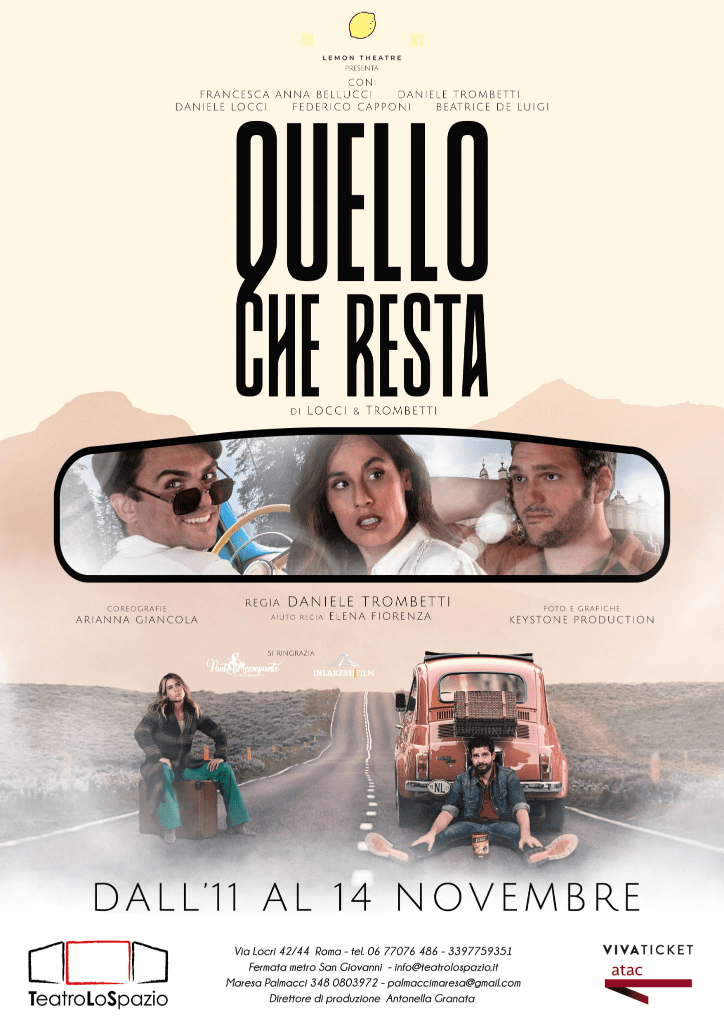 Debutta in prima assoluta al Teatro Lo Spazio, dall’ 11 al 14 novembre, “Quello che resta”, spettacolo scritto da Daniele Trombetti e Daniele Locci, con la regia dello stesso Trombetti con oltre ai due registi anche Francesca Bellucci, Beatrice de Luigi, Federico Capponi.