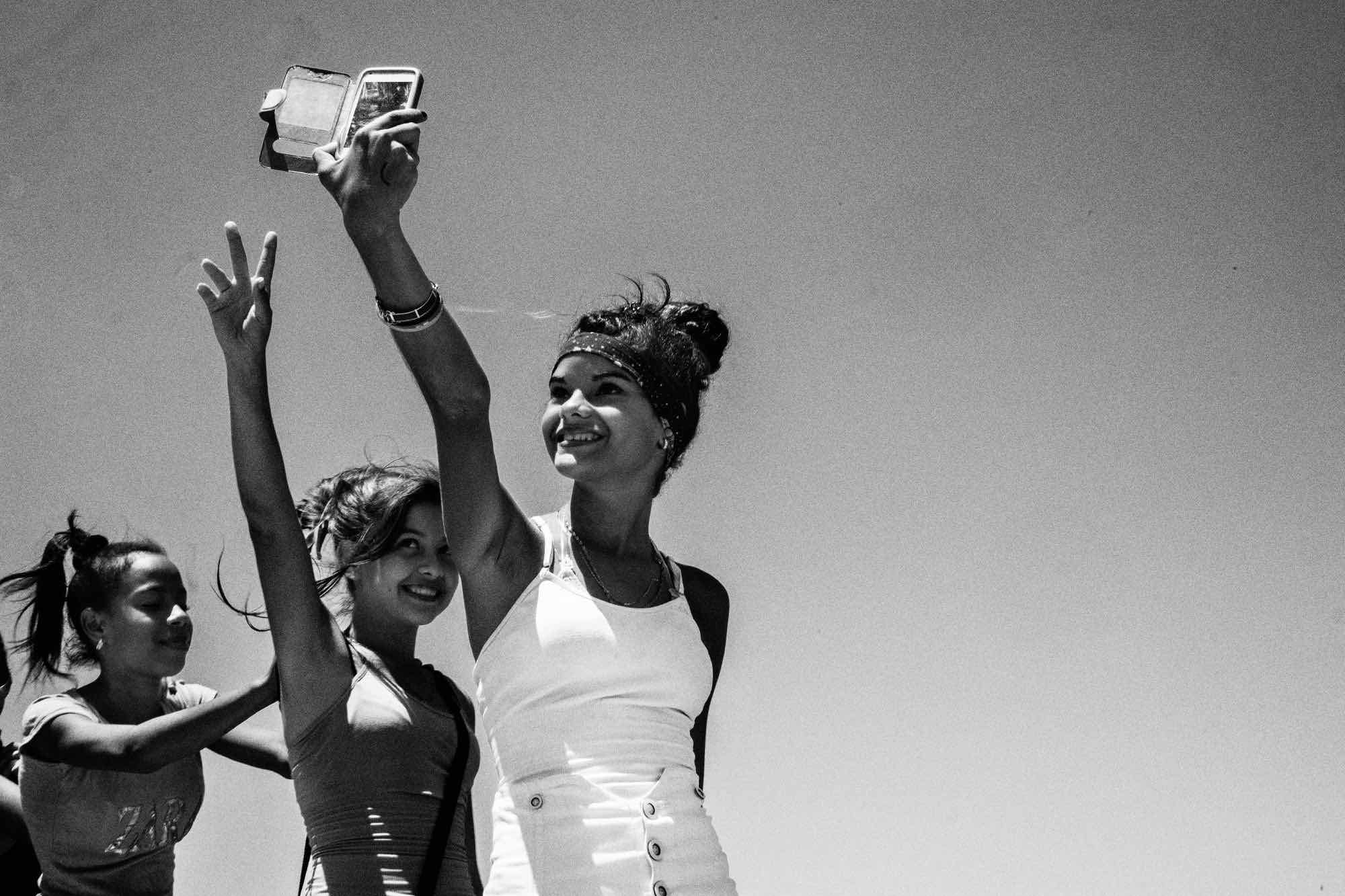 Negli oltre 60 scatti il colore si alterna al bianco e nero: quello del turbante giallo di una donna fiera, o dell’ombretto lilla di una ragazzina dolce. ‘Senza’ colore la faccia di un uomo che sbuca da un muro, sigaro in mano e sguardo lontano o la bambina che passa veloce lasciandosi dietro spazzatura e una cabriolet. Guardano dritto in camera, invece, le tre generazioni di donne che ridono di una gioia che sa di vittoria e speranza. Per esserci, per quel che sarà e perché continuano a crederci.Proprio quello che si vede sempre meno dall’altra parte dell’Atlantico, nell’Europa dei cittadini liberi e senza passaporti ma pronti a divorzi e muri da costruire.Ancora più sorprendente la risata di una donna che ha il volto illuminato dallo schermo del cellulare. Ride il ragazzo seduto accanto a lei, scoppiano in una risata che non ha pace i due giovani dietro di loro, per strada. Attimi catturati dall’occhio del fotografo tanto spontanei da sembrare irreali.Sarà questa la revolucion de Cuba?.