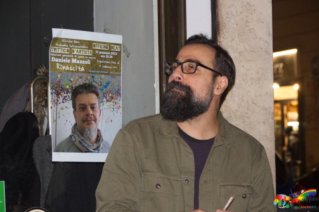 Di tutto questo ha parlato Daniele Mazzoli rispondendo alle domande di Stefania Visconti, la conduttrice di Trittico d’Artista il format ideato da Andrea Alessio Cavarretta che ne è anche il curatore. Un trittico che si conferma tale anche nell’organizzazione che vede l’impegno di Officine Beat, Kirolandia e CulturSocialArt in un percorso culturale, impegnando un sabato al mese con la presentazione di un artista nella splendida location di San Lorenzo le Officine Beat il cocktail bar bistrot più glamour della zona. Non solo, ma all’interno del pub è possibile assaggiare il cocktail preparato per l’occasione da Officine Beat, in onore dell’artista.