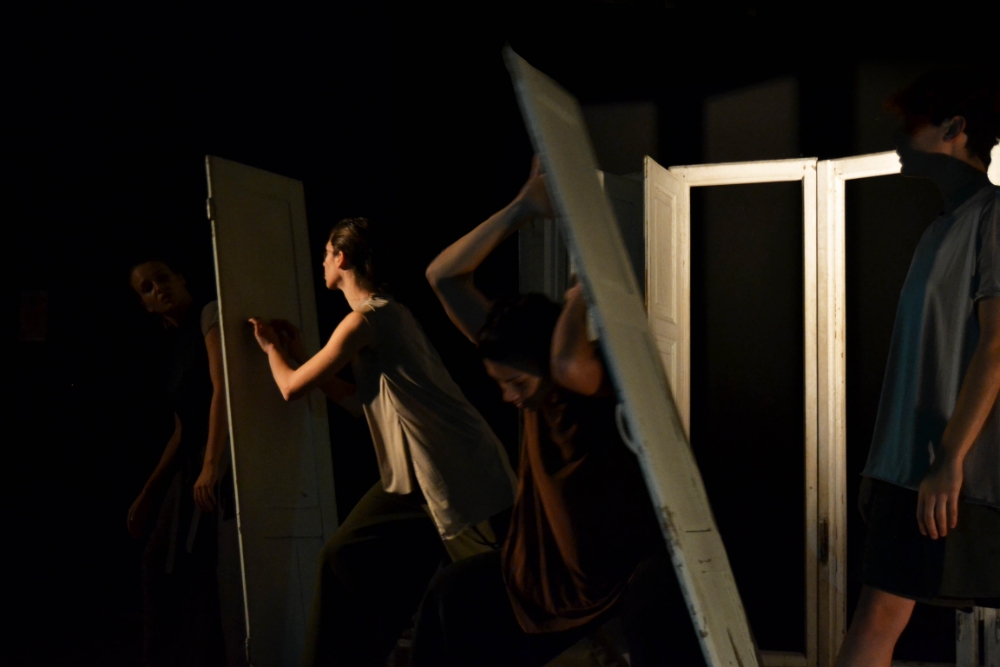 Durante i miei anni all’Accademia di Belle Arti ho maturato una mia passione per l’arte materica e tutti i miei lavori risentono di quella influenza. Ho raccolto le otto porte-finestre che compongono la scenografia per strada, le ho riciclate, assemblate insieme con delle cerniere, vi ho montato delle ruote e ho fatto in modo che la sua modulabilità nello spazio servisse a stimolare varie suggestioni visive, creando ambienti diversi, dividendo gli spazi, mettendo in difficoltà le stesse performer che la muovono, diventando così la scenografia la rappresentazione fisica del viaggio, dello smarrimento, delle fratture e della frammentazione dello spazio alla deriva.