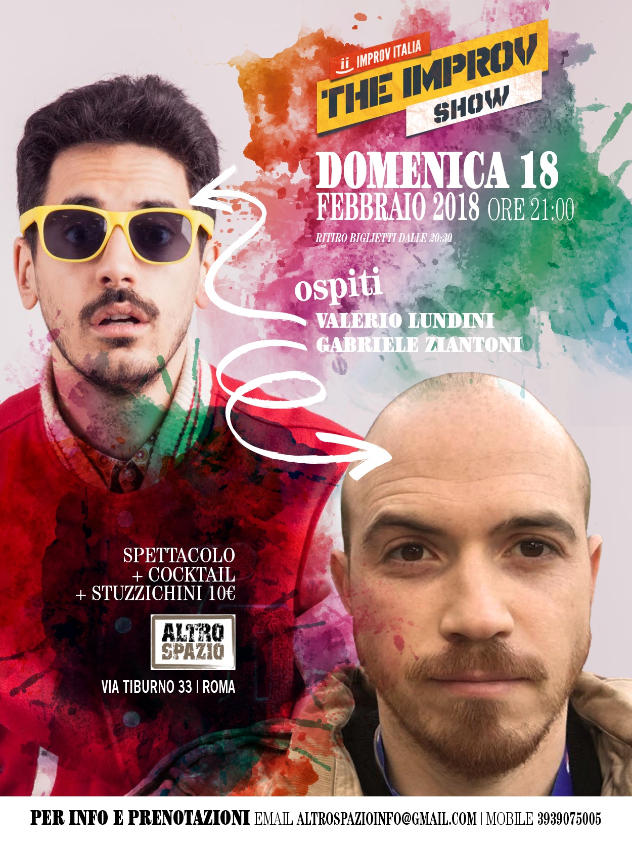Dopo Zerocalcare, Saverio Raimondo, Giampaolo Morelli, Johnny Palomba, Fabio Canino, Edoardo Ferrario, Matteo Corradini dei THE PILLS, gli Actual e Le Coliche, questo mese VALERIO LUNDINI e Gabriele Ziantoni si misureranno nell’ improv comedy come monologhisti, in uno spettacolo che porta finalmente anche in Italia una rivoluzione della comicità.