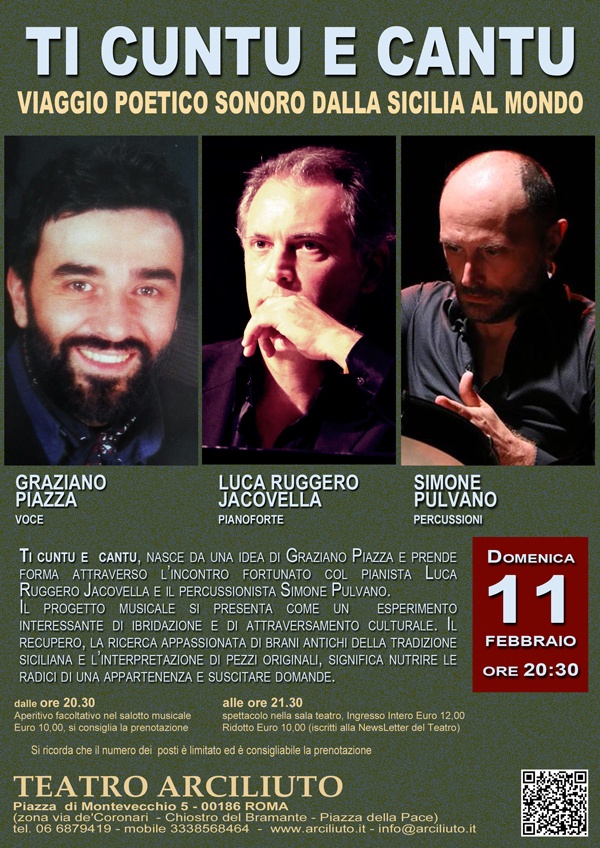 Domenica 11 febbraio 2018, al Teatro Arciliuto di Roma “TI CUNTU E CANTU” – Viaggio poetico sonoro dalla Sicilia al mondo – spettacolo che nasce da una idea di Graziano Piazza (voce) e prende forma attraverso l’incontro fortunato col pianista Luca Ruggero Jacovella e il percussionista Simone Pulvano.
