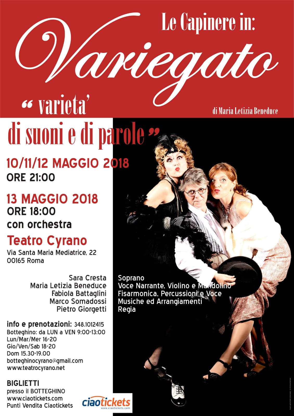 Varietà di suoni e di parole: lo spettacolo intitolato “Variegato” e proposto dal trio “Le Capinere”, è una innovativa formula di “concerto rappresentato”. Esso infatti si colloca a metà tra l’idea tradizionale di concerto e quella di rappresentazione teatrale, senza essere altresì confusa, con quella del Varietà tradizionale. Variegato per l’appunto, è uno spettacolo nuovo, diverso, che presenta una ricchissima varietà di colori, scene, musiche, luoghi e stati d’animo in non più di 60 minuti e interpretato magistralmente dalle sue tre protagoniste le quali, provenendo dal professionismo, ne hanno curato personalmente gli arrangiamenti musicali. Ambientato all’interno degli anni ’30 e ’40, questo spettacolo, ripercorre attraverso l’escamotage scenica della sua protagonista iniziale, Mariù, alcune delle canzoni più significative di quell’ epoca, non raccontando semplicemente una storia ma, ponendo il pubblico al centro della scena attraverso una riflessione intima e corale sul significato e la collocazione dell’Amore, tema intramontabile nonostante il tempo a cui appartiene. Ritmi e sonorità romantiche perciò, si alterneranno a toni umoristici, forti e travolgenti che saranno sottolineati da cambi di scena velocissimi, minimalisti ma determinanti per le caratteristiche dello spettacolo stesso. Sapranno coinvolgere e trasportare il pubblico di tutte le età, in un viaggio “Variegato”, ricco di emozioni e di simpatia, grazie alle grandi doti artistiche che evidenziano le qualità istrioniche e specifiche delle tre Capinere in scena.