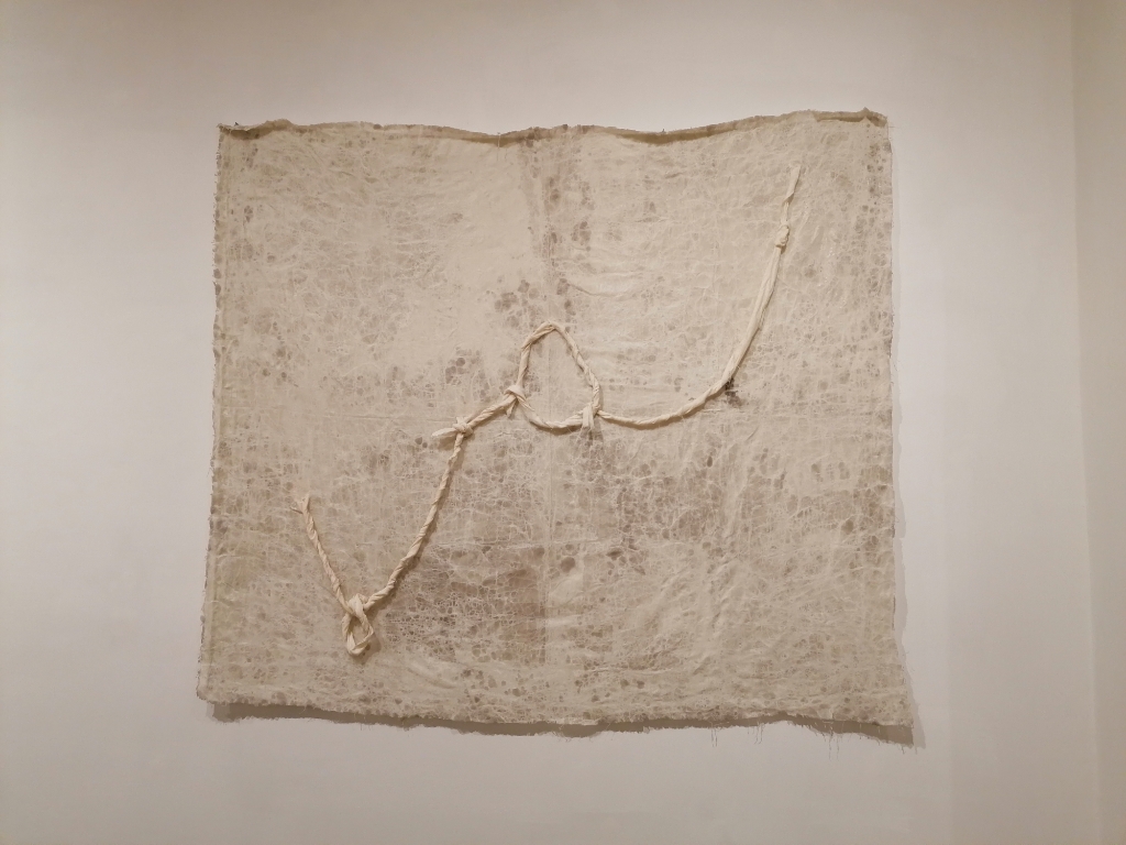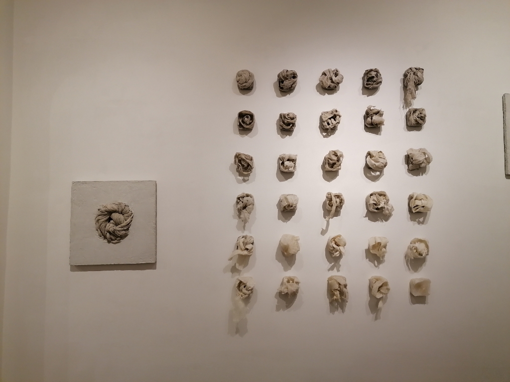 Autrice di un felice connubio pittorico scultoreo, le opere esposte fanno parte di un lavoro portato avanti da Spernazza lungo il tempo: cera e lembi di tela sono modellati come pittura iper materica, annodate o fissate in modo da prendere aggrovigliate come qualcosa di corporeo incontenibile nella bidimensionalità una pittura. Il tessuto annodato intriso nella cera, si allontana dal semplice macramè per allinearsi ad opere che ricordano il biomorfico, lasciando impregiudicata la sensazione di traccia umana organica. La vita sembra essere sopita immersa nel candore dei media usati dall’artista. Il materiale vulnerabile, corruttibile, evoca tanto il corpo soggetto al tempo quanto l’interiorità che vibra ad un ogni soffio che la attraversa. Queste forme morbide incrociano il lavoro di Speranza con la ricerca portata avanti da grandi artiste del 900, da Louise Bourgeois a Carol Rama: personale, femminile, corporea.